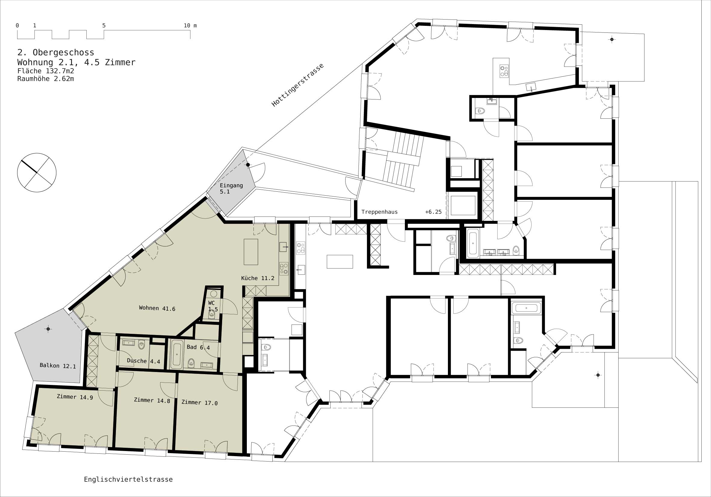 Whg. 2.1 Grundriss: Nutzfläche nach SIA 416 (statische Wände und Installationsschächte nicht eingerechnet).